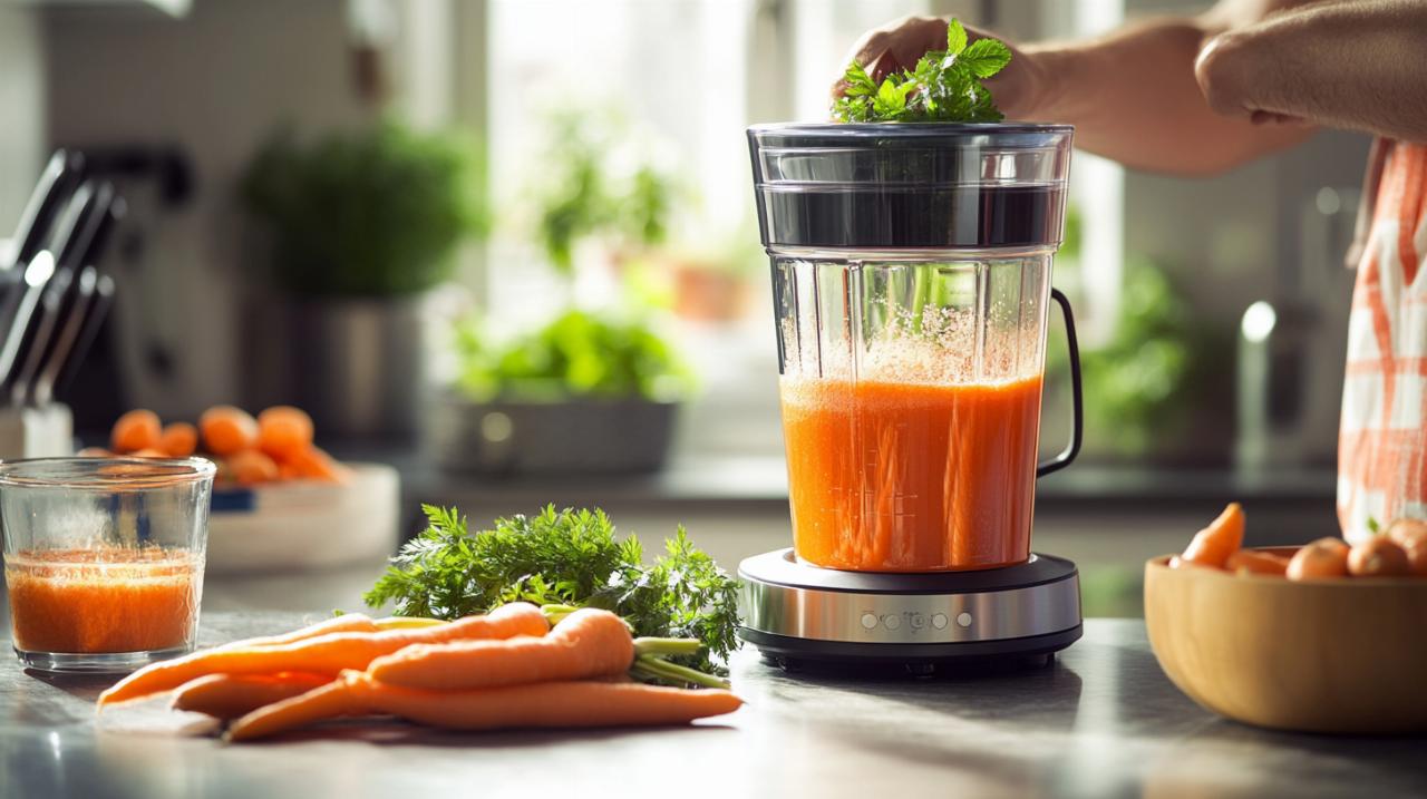 Réaliser un jus de carotte au blender est à la portée de tous et ne nécessite que quelques minutes de préparation. Cette méthode présente l'avantage de conserver une partie des fibres du légume, contrairement à d'autres techniques d'extraction. Pour obtenir un résultat optimal, il suffit de disposer des bons ingrédients et de suivre une démarche simple mais rigoureuse. Le blender transforme les carottes en une boisson onctueuse tout en préservant leurs propriétés nutritionnelles exceptionnelles.